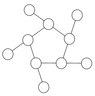 さて, 下の図に1~10の数字を当てはめ, 各列の数字の和が等しくなる"magic" 5-gon ringを作って, それを表す16桁または17桁の数字のうち, 16桁のものの最大の数字を答えよ.