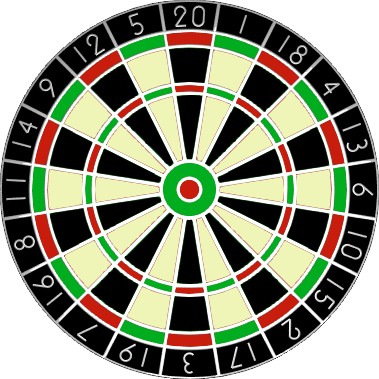 ダーツの点数は, ダーツが刺さった領域の番号によって決まる. 外側の赤緑の輪の外に刺さったダーツは 0 点である. この輪の内側の黒と白の領域はシングル (1 倍) の点数を表している. しかし, 外側と内側の赤緑の輪はそれぞれダブル (2 倍) とトリプル (3 倍) の点数である.