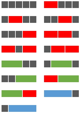 黒い正方形のタイルと, 2 ユニットの長さの赤のタイル, 3 ユニットの長さの緑のタイル, 4 ユニットの長さの青のタイルから選んで組み合わせて, 5 ユニットの長さの 1 列をタイルで敷く方法はちょうど 15 通りある.