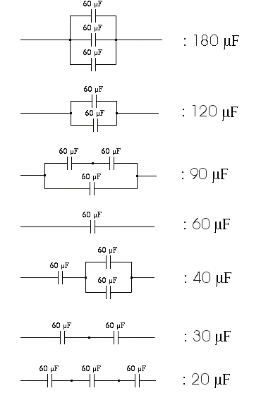 この単純な手続きを個以下の理想的なキャパシタに適用し, 全体の静電容量が異なる複数の回路を構成することができる. 例えば, 60μFのキャパシタでの場合は, 以下のように7通りの異なる静電容量を得ることができる.