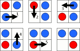 スライドパズルでは, カウンタを空白のスペースに向けて横または縦へスライドさせることができる. ゲームの目的は, 赤のカウンタを盤の左上角から右下角へ動かすことである;スペースはつねに右下角にある状態から始まる. 例えば次の一連の図は, の盤にて5手でゲームを完了させる様子を示している.
