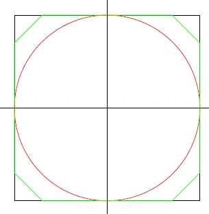 あなたは紙の上で予備計算を行った.の壁での土地を囲うと, 囲われた面積/壁の長さの比は125となる. 認められてはいないが, いくらか良いかもしれないアイデアを試してみよう:正方形の内部に, 四辺に接するように円を置けば, 面積は に等しく, 周囲の長さはとなり, したがって囲われた面積/壁の長さの比はこれも125となる.
